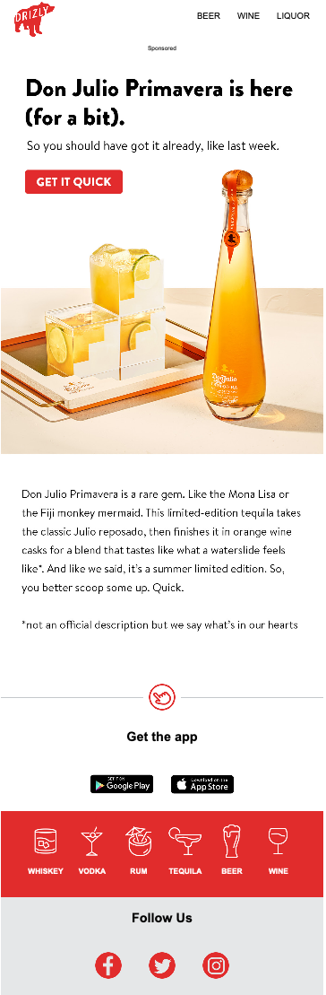 Created email copy for Drizly featuring Don Julio Primavera, highlighting the premium tequila’s heritage, flavor profile, and exclusivity. The messaging balanced aspirational storytelling with clear product benefits, emphasizing the luxury and craftsmanship of the offering while driving awareness, engagement, and purchase intent. Subject lines, preheaders, and body copy were crafted to entice exploration and conversion among Drizly’s audience of spirits enthusiasts.